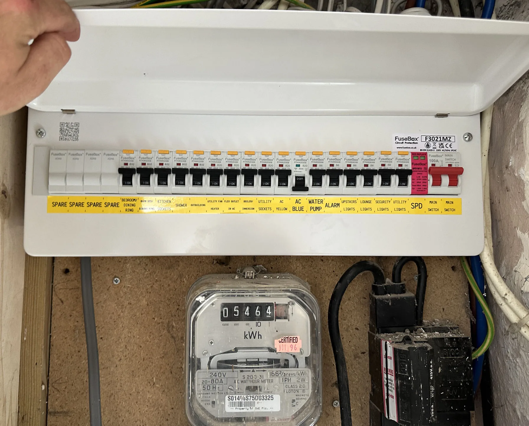 The existing meter tails required upgrading to 25mm double insulated cabling to handle the electrical load safely and comply with current standards. Meter tails are the cables that connect the electricity meter to the consumer unit, and their capacity directly affects the overall electrical supply to the property. Upgrading these cables provides a more robust connection and reduces the risk of overheating under high electrical loads.