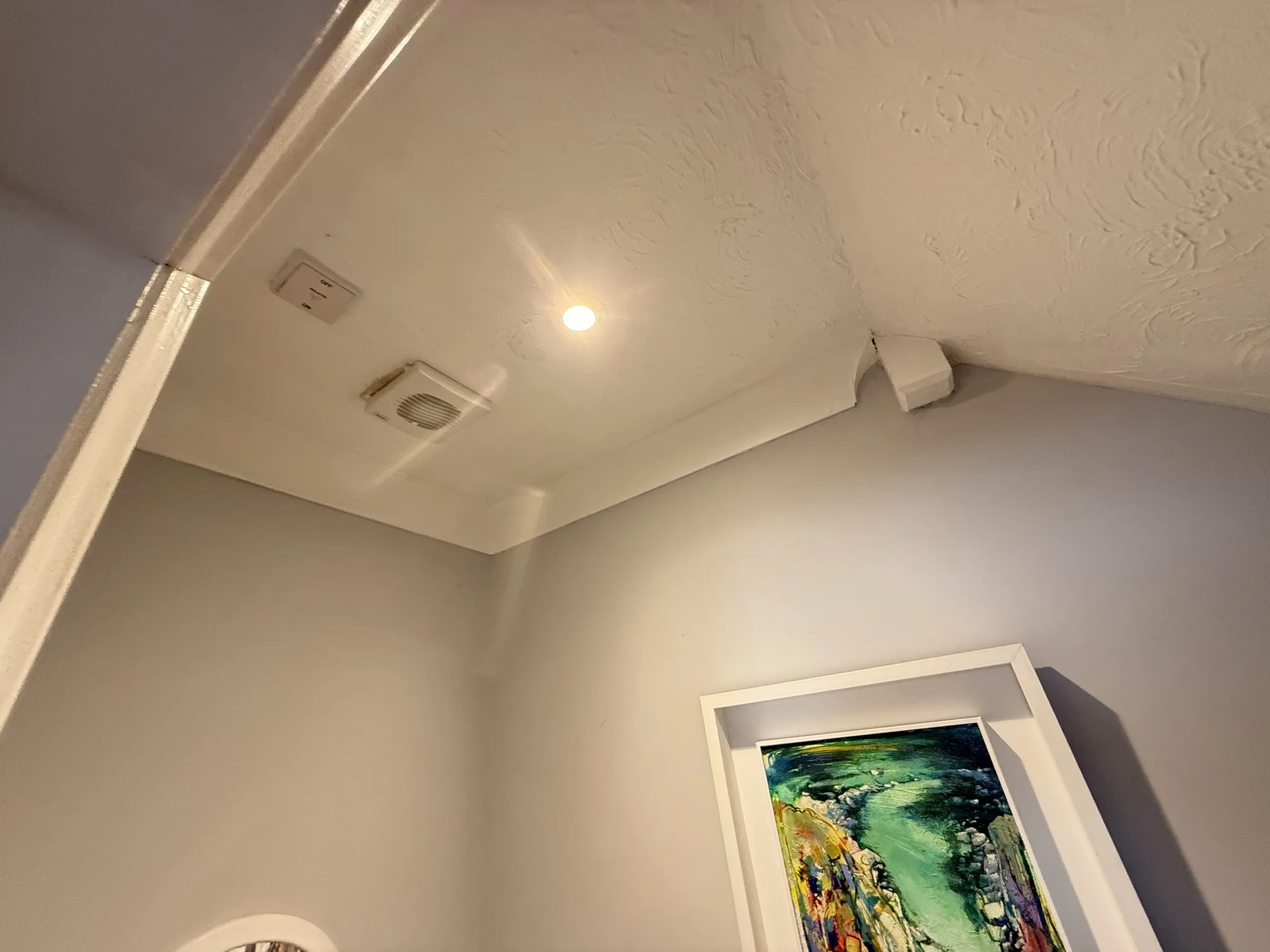 Bathroom improvements focused on ventilation efficiency and lighting quality. The WC received a new warm white LED downlight, replacing the existing centre light fitting with a more modern and energy-efficient alternative. Both bathrooms underwent ventilation upgrades with the installation of five-inch loft-mounted extractor fans featuring timer overrun facilities. These new units were connected via insulated aluminium ducting that routes air and water vapour to the exterior through existing vented roof tiles, providing superior moisture extraction compared to the previous system.