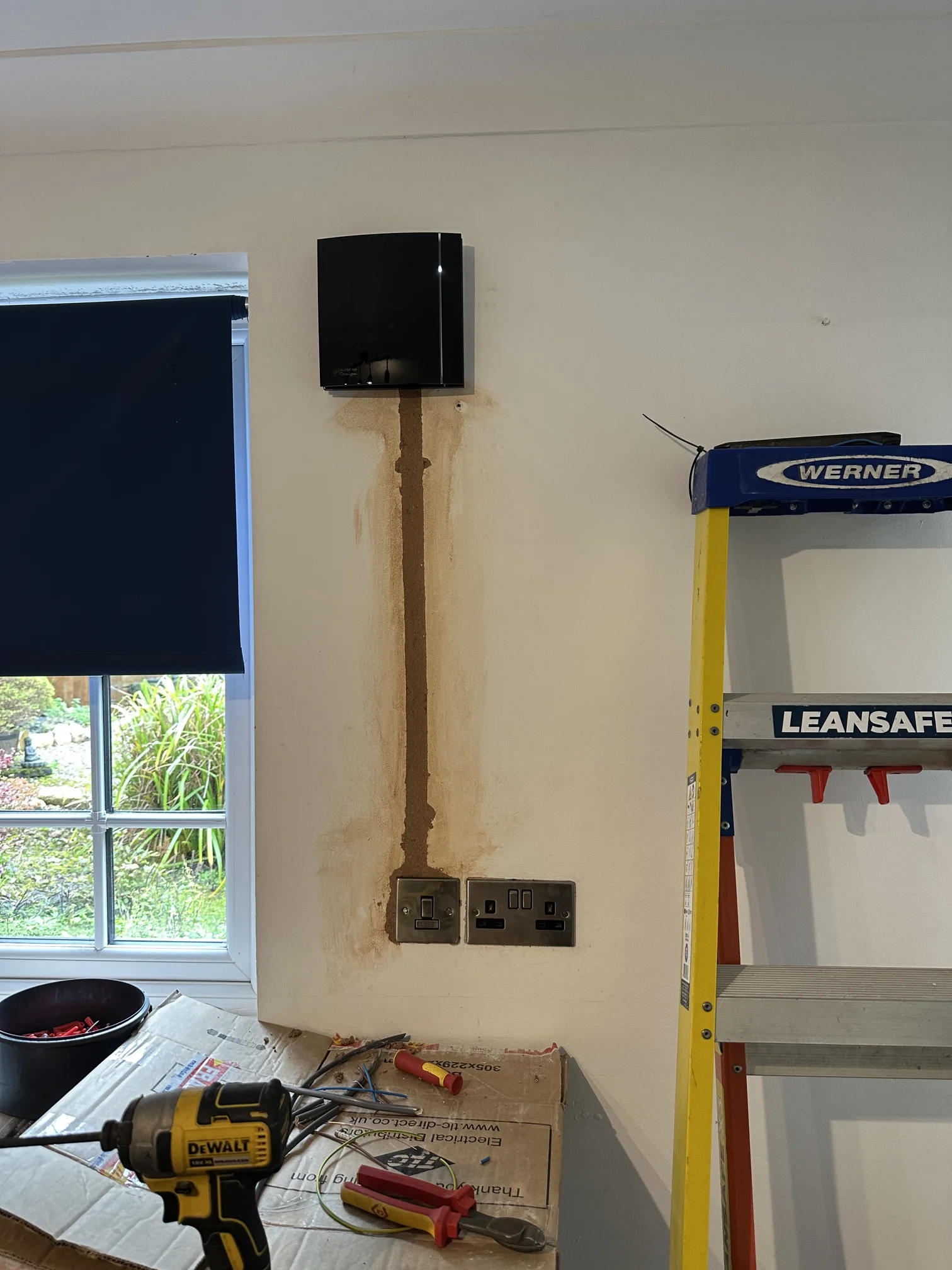 With the core drilling completed and the external vent fitted, attention turned to the electrical supply. The fan required a dedicated connection, and the most practical source was the existing countertop socket outlet. This involved installing a fused connection unit that would provide both isolation and overload protection for the fan circuit. The homeowner wanted this switch positioned adjacent to the existing socket for convenient access, which meant recessing a metal back box into the masonry wall.