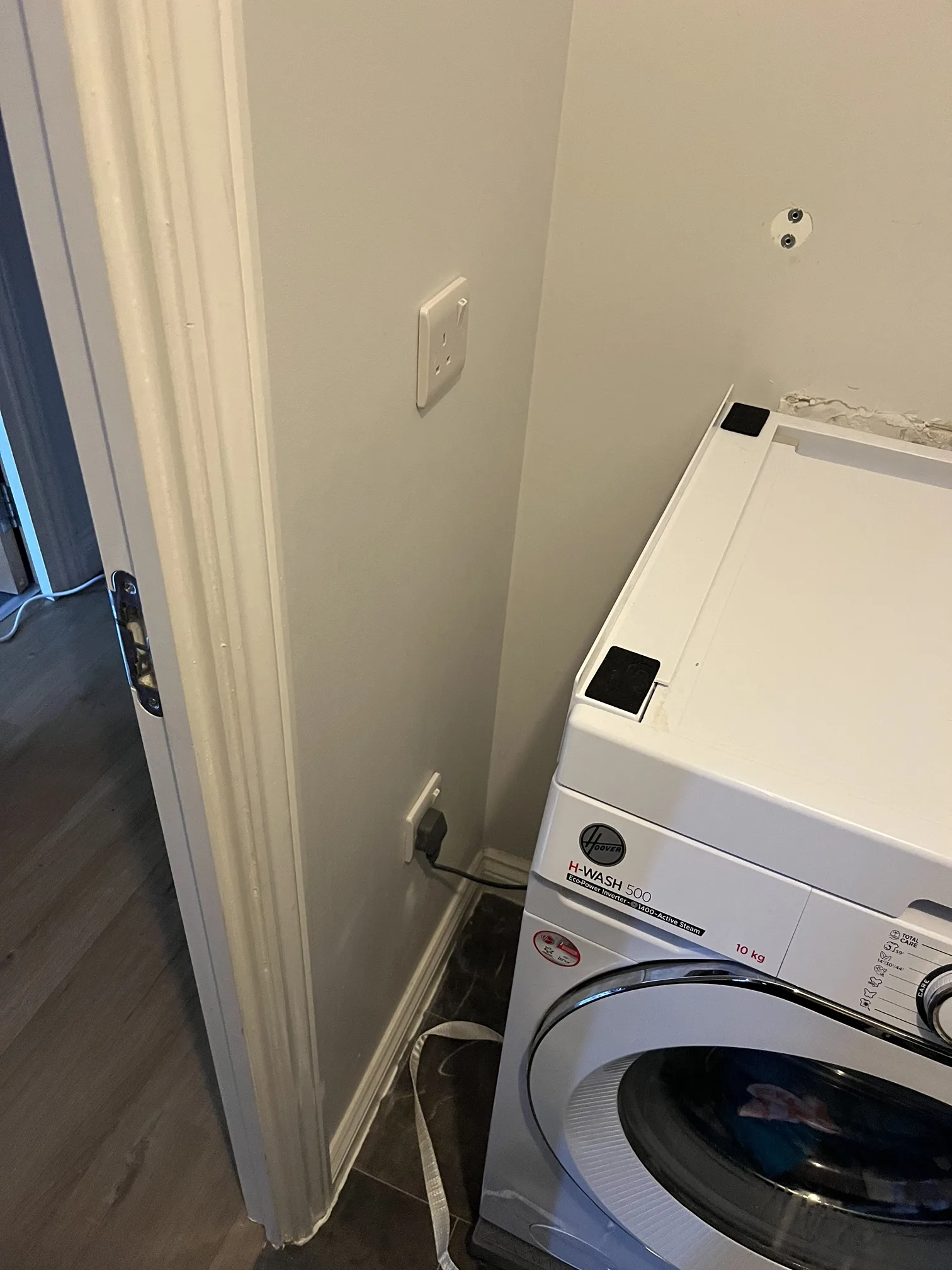 Taking a spur from an existing socket circuit is often the most practical solution when adding new outlets during refurbishment work. It avoids the need to run cables back to the consumer unit, reducing both cost and disruption. However, this approach requires careful consideration of the existing circuit’s loading. We calculated the additional demand from the washing machine and tumble dryer to verify that the hallway socket circuit could accommodate the extra load without overloading. Modern washing machines and tumble dryers draw significant current, particularly during heating cycles, so this isn’t a step to skip.