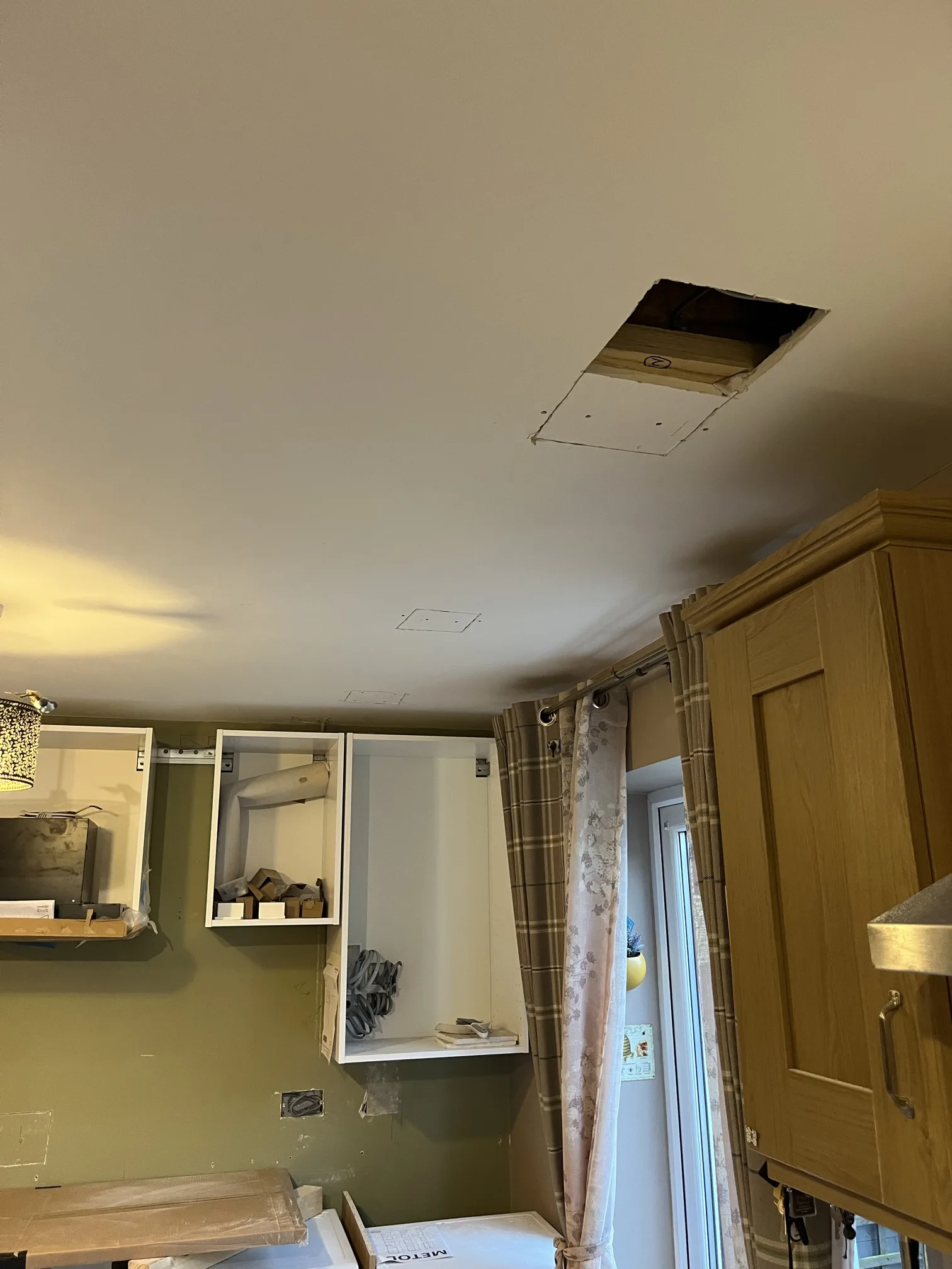 The recirculating extractor fan outlet was positioned with the ducting route in mind, even though we wouldn’t be connecting the fan itself until the second fix. The same principle applied to all the integrated appliances – we positioned outlets where they needed to be based on the kitchen plan, leaving everything ready for when the units got fitted.