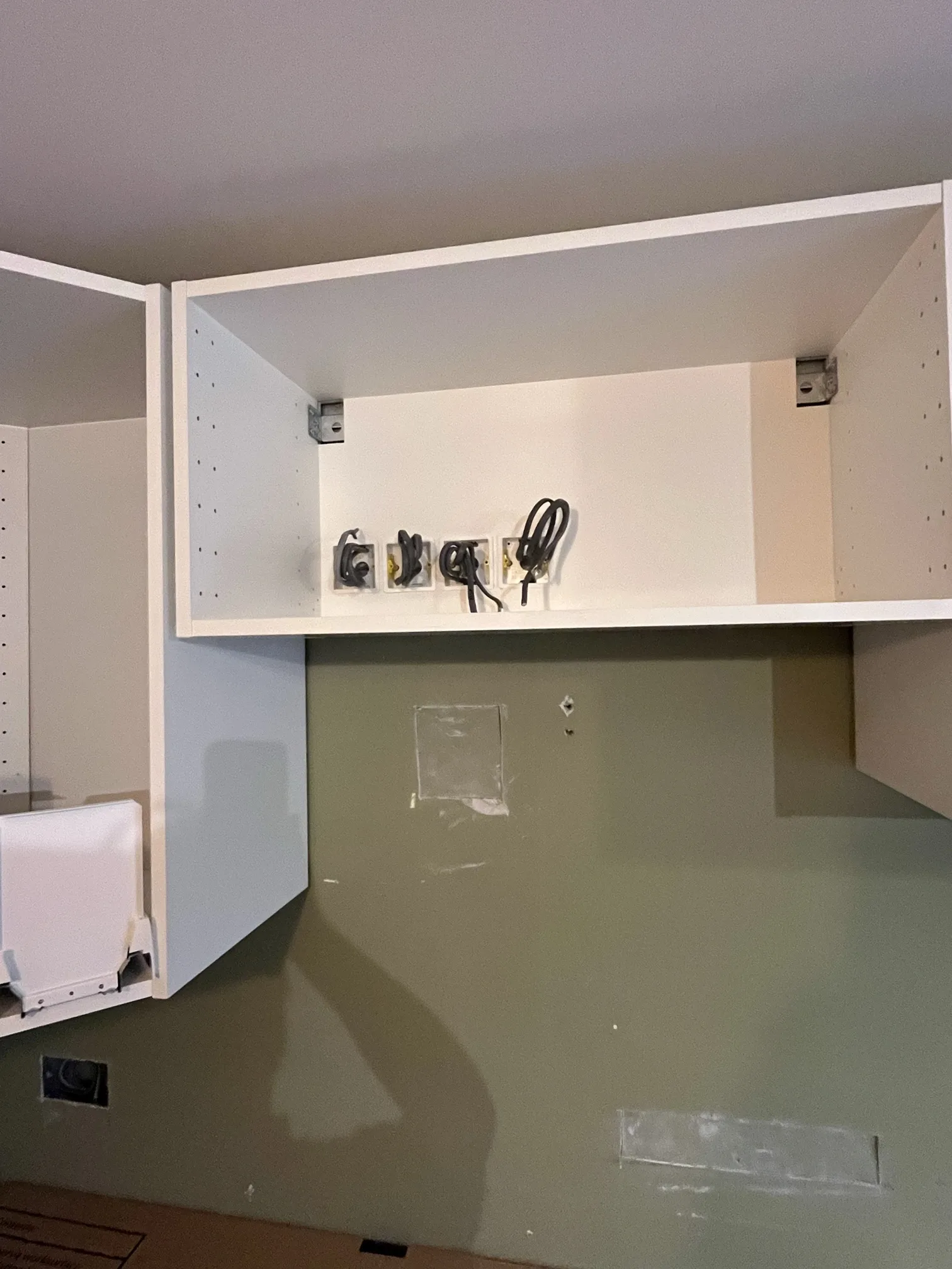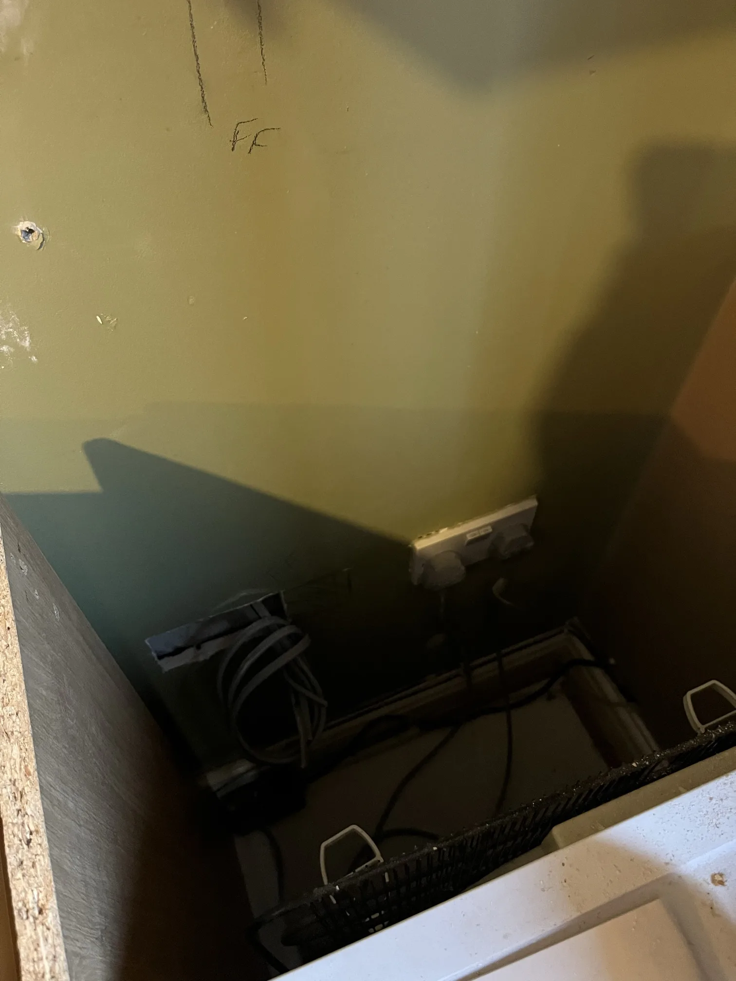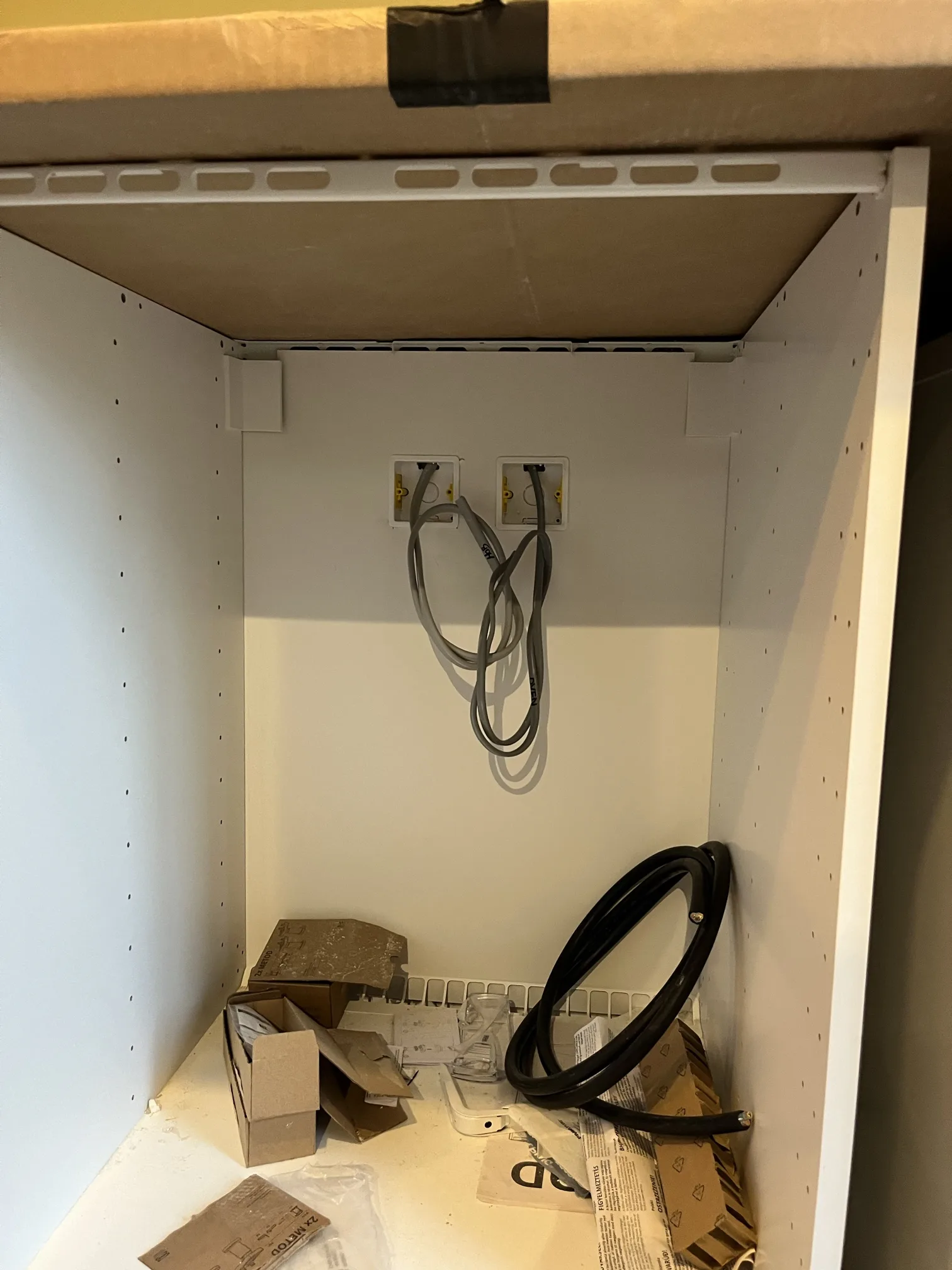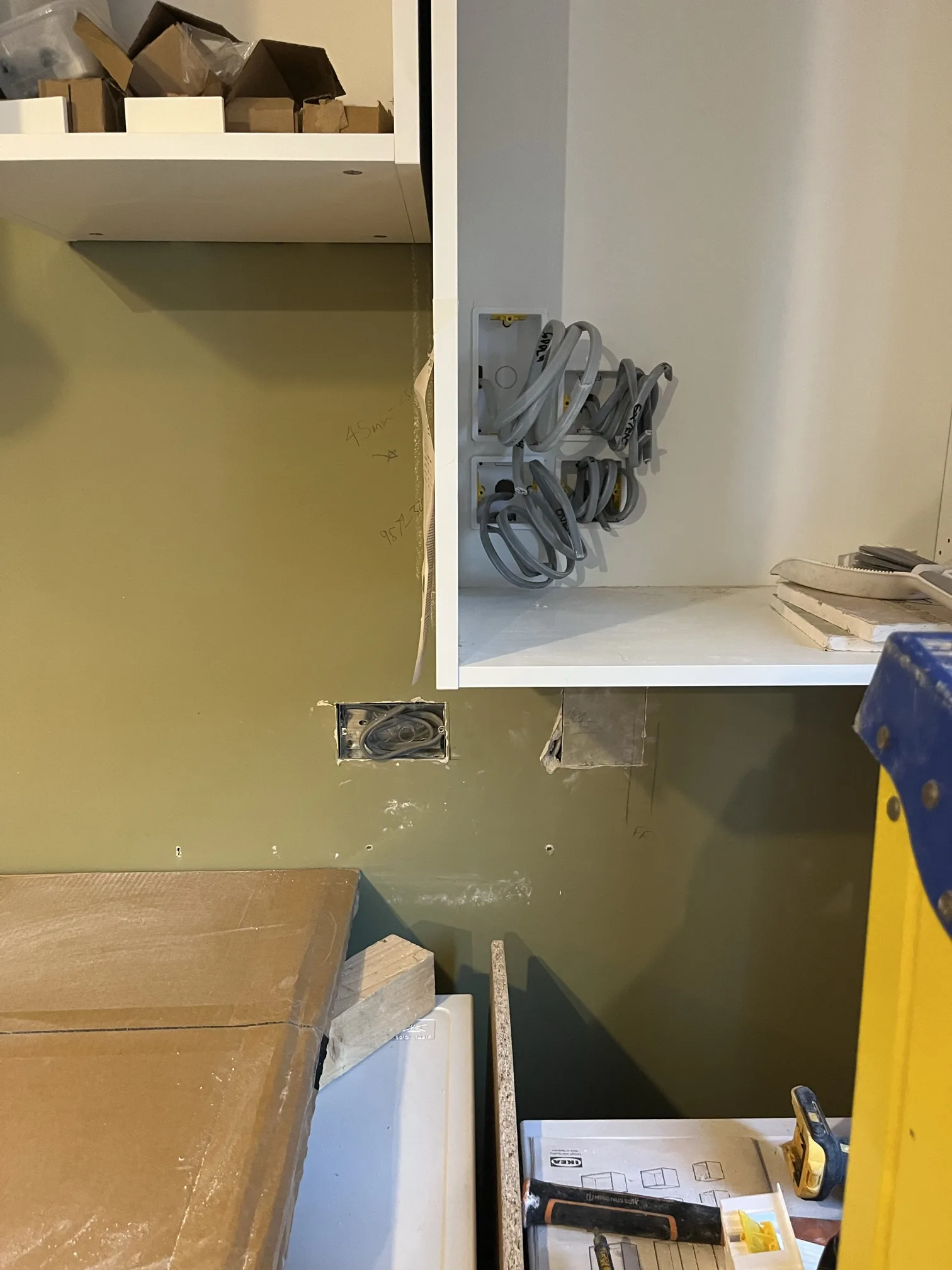 Beyond the standard socket outlets, we had to account for all the built-in appliances that would be part of the finished kitchen. A fridge, freezer, dishwasher, recirculating extractor fan, washing machine and integrated microwave all needed their own dedicated outlets. Each of these appliances would have isolators positioned in the cupboard above where the microwave would eventually sit, giving easy access for switching things off when needed without having to pull appliances out.