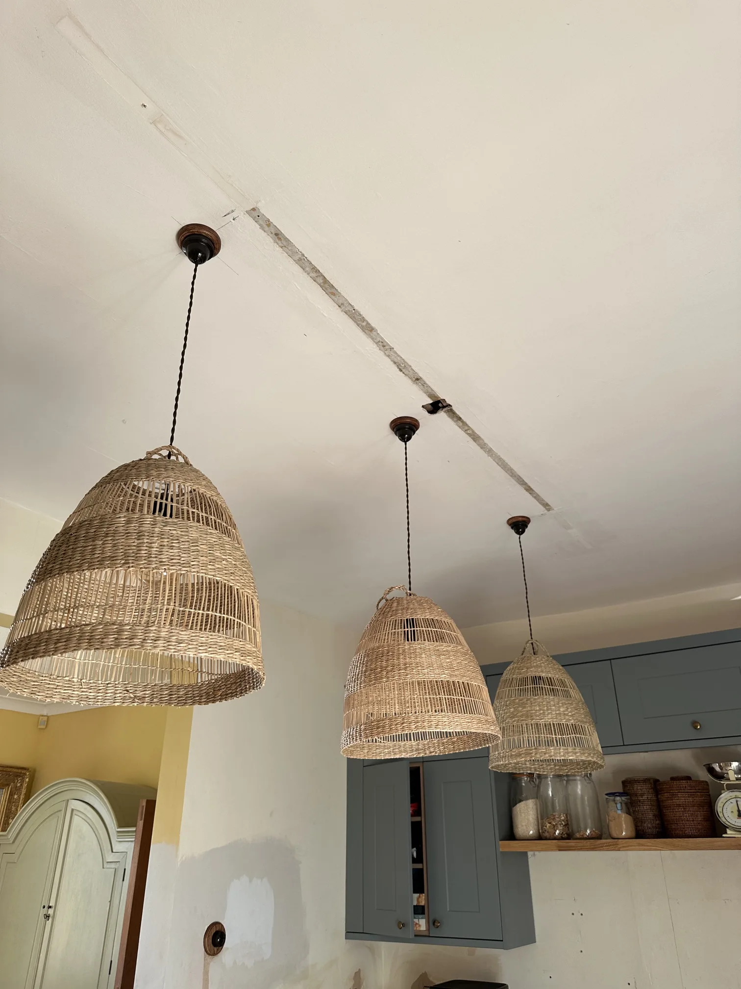 The centre lighting arrangement underwent modification during the project. Instead of standard ceiling fittings, three client-supplied pendant lights were installed, with wiring adjusted accordingly to accommodate their specific requirements and positioning. One of these pendants was fitted in the kitchen, whilst LED components were installed within the kitchen chimney breast. This installation presented an interesting challenge – the LED driver and components needed to be concealed up inside the chimney structure, hiding the technical elements whilst allowing the light output to create a feature within this architectural detail.