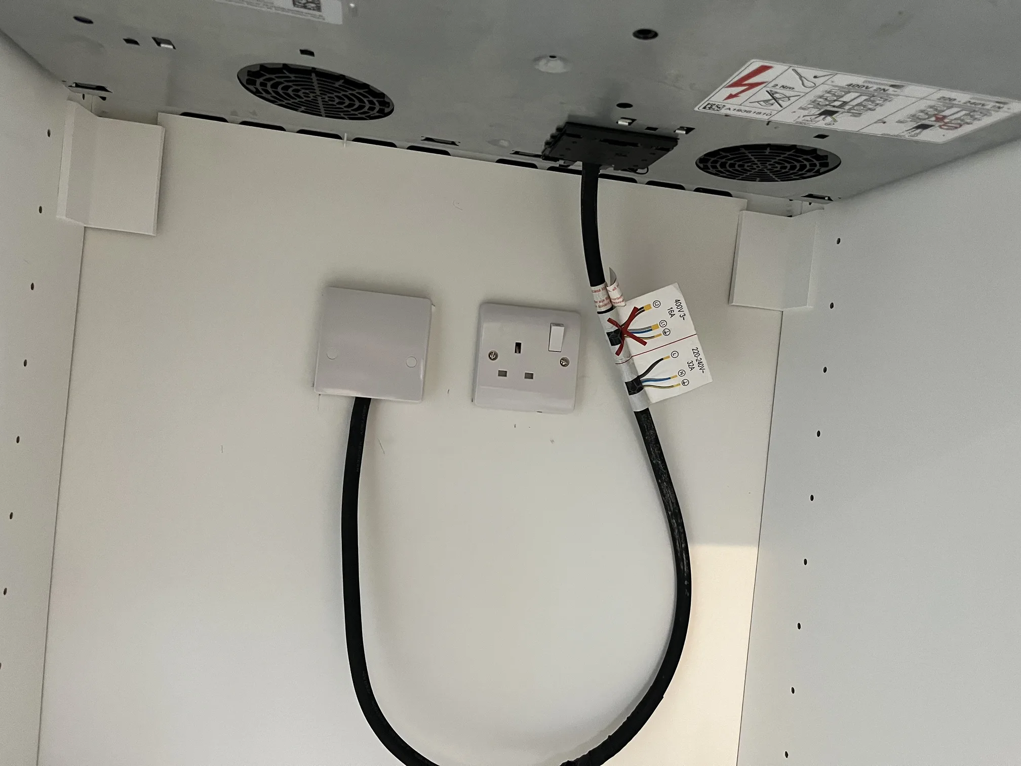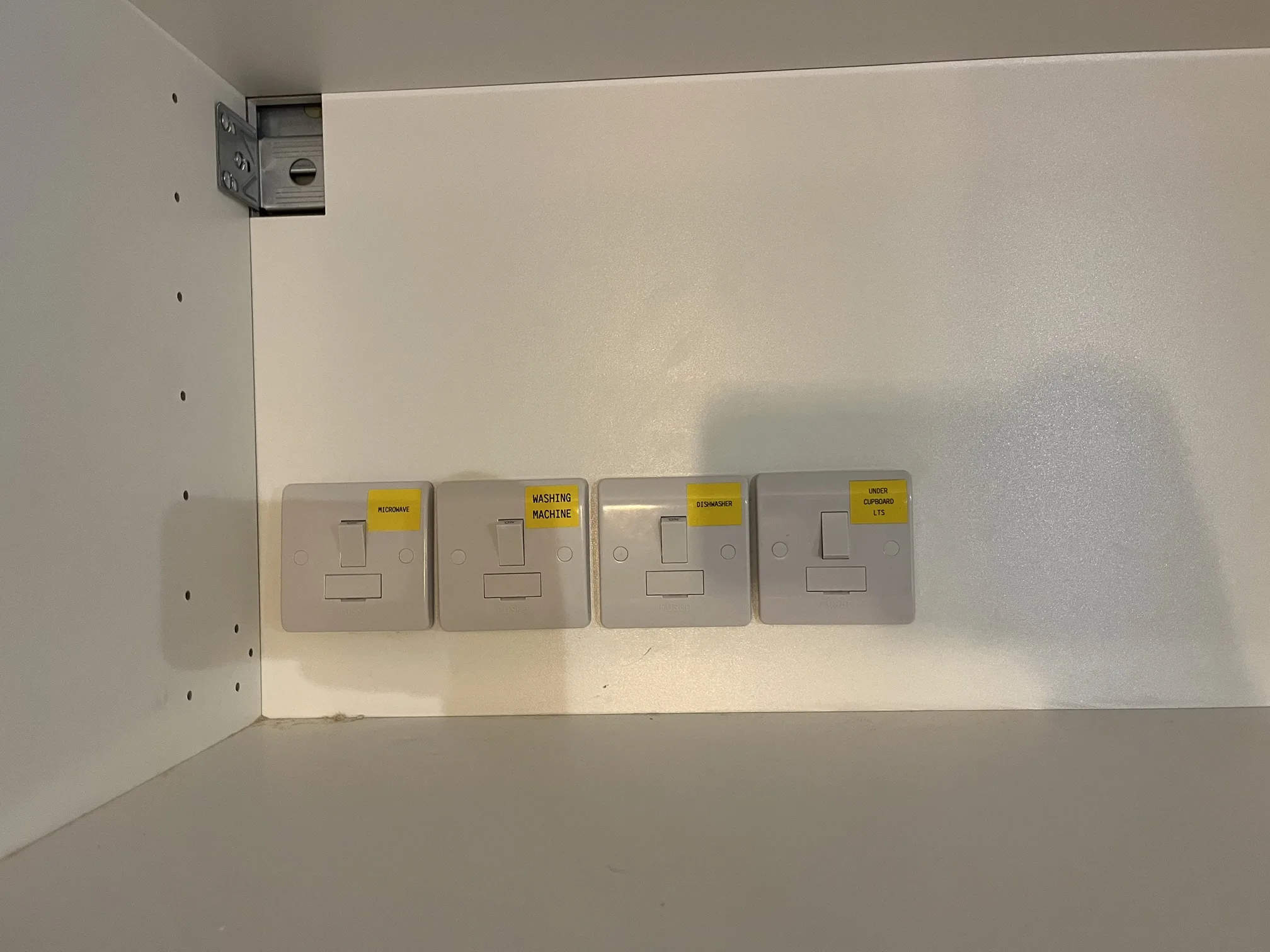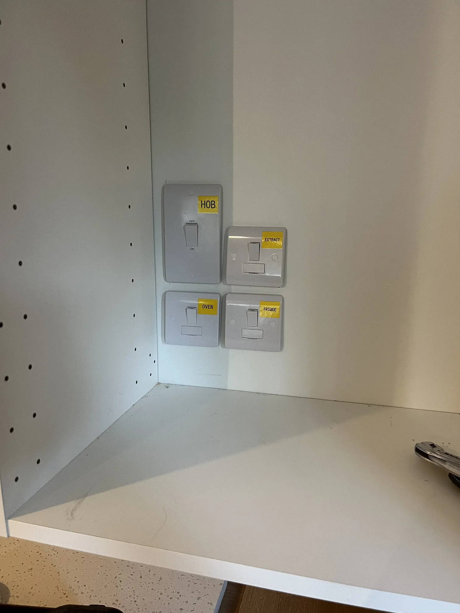 The isolator switches for these appliances were grouped together in the cupboard above the microwave position. This approach keeps them accessible without cluttering up the visible areas of the kitchen. If you ever need to isolate an appliance for maintenance or if there’s a fault, you can simply open that cupboard and switch off the relevant isolator. Each switch was labelled clearly – microwave, washing machine, dishwasher, extractor, fridge, and freezer – so there’s no confusion about which controls what.
