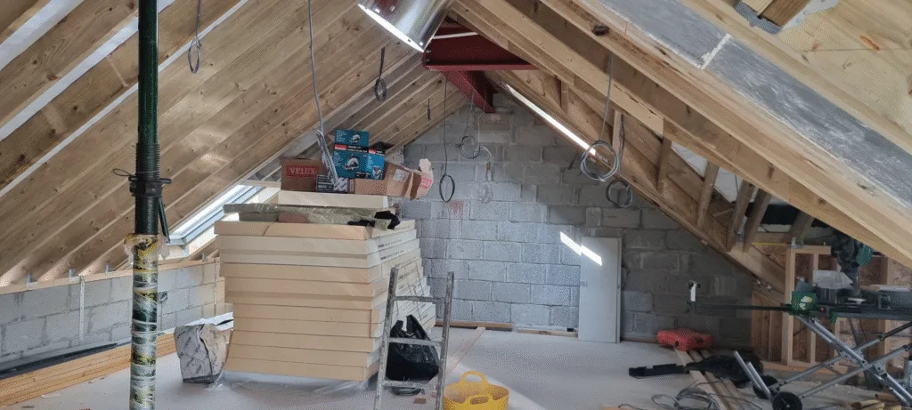 The loft space on this project presents typical challenges for new build electrical work. The roof structure is fully exposed, allowing us to secure cables properly and run them to where they need to go. Loft wiring needs extra care – cables must be protected from potential damage and installed in ways that account for future insulation and access needs. You’re thinking ahead to how the loft might be used years down the line, making sure nothing you do now creates problems later.