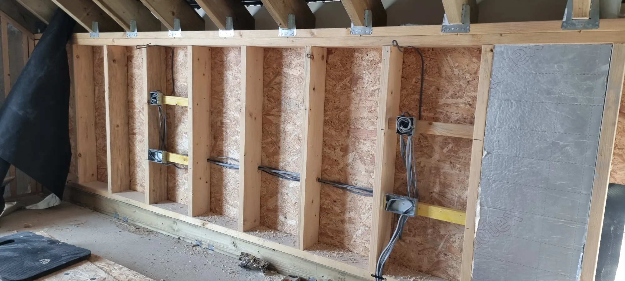 The studwork walls provide straightforward access for running cables vertically and horizontally between rooms. Cables are being looped out ready for the second fix stage, when we’ll return to fit all the sockets, switches and light fittings once the walls are plastered and decorated. These loops need to be long enough to work with comfortably but not so excessive that they create problems behind the finished wall.